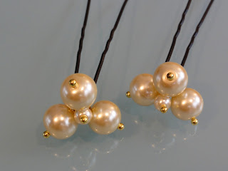 Urocze i funkcjonalne kokówki ze szklanych, dużych (1cm) pereł w kolorze ecru ozdobione szpilami w złotym kolorze. Szpilki wpięte we włosy wyglądają bardzo efektownie i nadają fryzurze unikalnego charakteru.