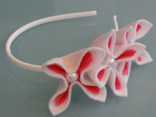 Opaski z elastycznego i bardzo wytrzymałego kauczuku, w kolorze czarnym matowym lub białym (szerokość opaski 0,5cm), ozdobiona uroczymi kwiatami z filcu (kolor kwiatów może być dowolny).