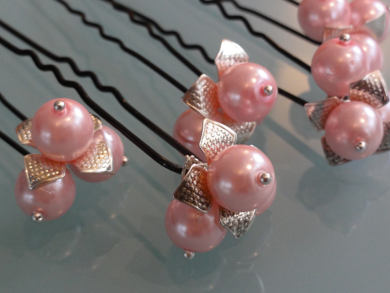 Urocze i funkcjonalne kokówki ze szklanych, dużych (1cm) pereł w kolorze delikatnego różu. Jedna z pereł ozdobiona jest posrebrzaną przekładką w kształcie kwiatu. Szpilki wpięte we włosy wyglądają bardzo efektownie i nadają fryzurze unikalnego charakteru.