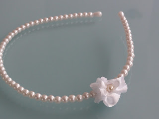 Urocza cienka opaska, rozmiar uniwersalny, ozdobiona satynową białymi perełkami i delikatnym białym satynowym kwiatkiem.