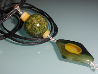 Oryginalny wisior z dwóch ceramicznych, pięknie zdobionych donatów oraz ślicznego żółtego jadeitu na ozdobnej owalnej obręczy oraz srebrnej krawatce. Łańcuszek dodatkowo ozdobiony delikatną zawieszką z motylem.