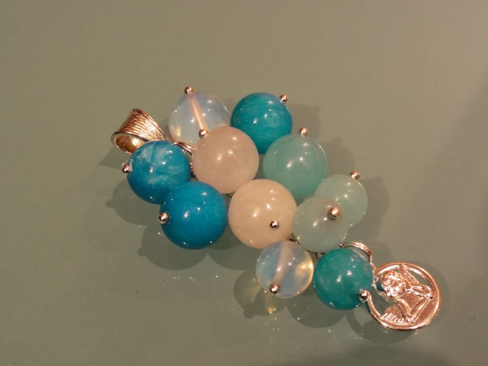 Jadeit, opal, marmur, nefryt i kwarc (1 i 1,2cm) ozdobione posrebrzaną figurką aniołka i ładną krawatką.