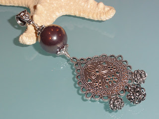 kolorze beżowo szarym pięknie ozdobiona czapeczką bali oraz orientalna metalowa kula bali z ażurowym motywem kwiatowym. Wisior zawieszony na długim posrebrzanym łańcuszku i ozdobnej krawatce. Polecam, w rzeczywistości wygląda jeszcze ładniej!